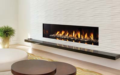 The front-facing linear fireplace can be strikingly integrated into any room.